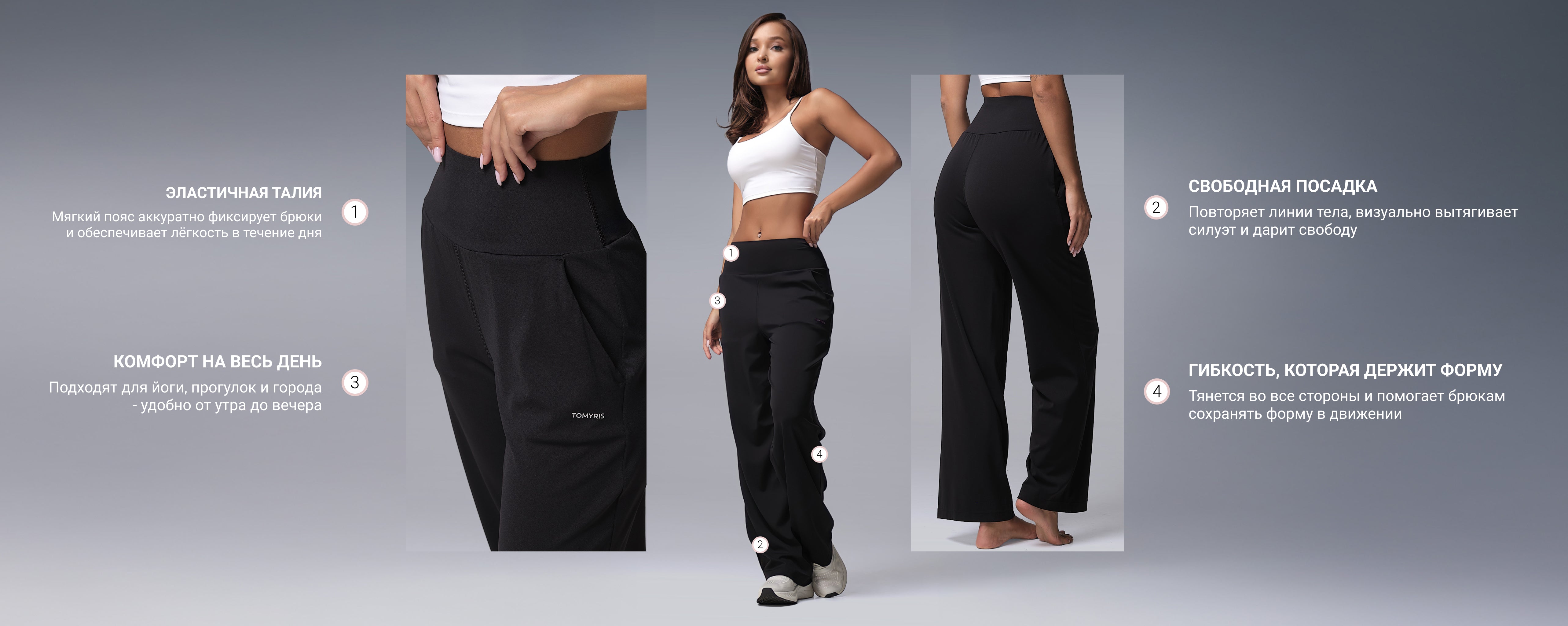Фитнес-брюки TOMYRIS олицетворение легкости и свободы. Мягкая фактура ткани создаёт ощущение невесомости: настолько лёгкие, что вы едва ощущаете их на теле.