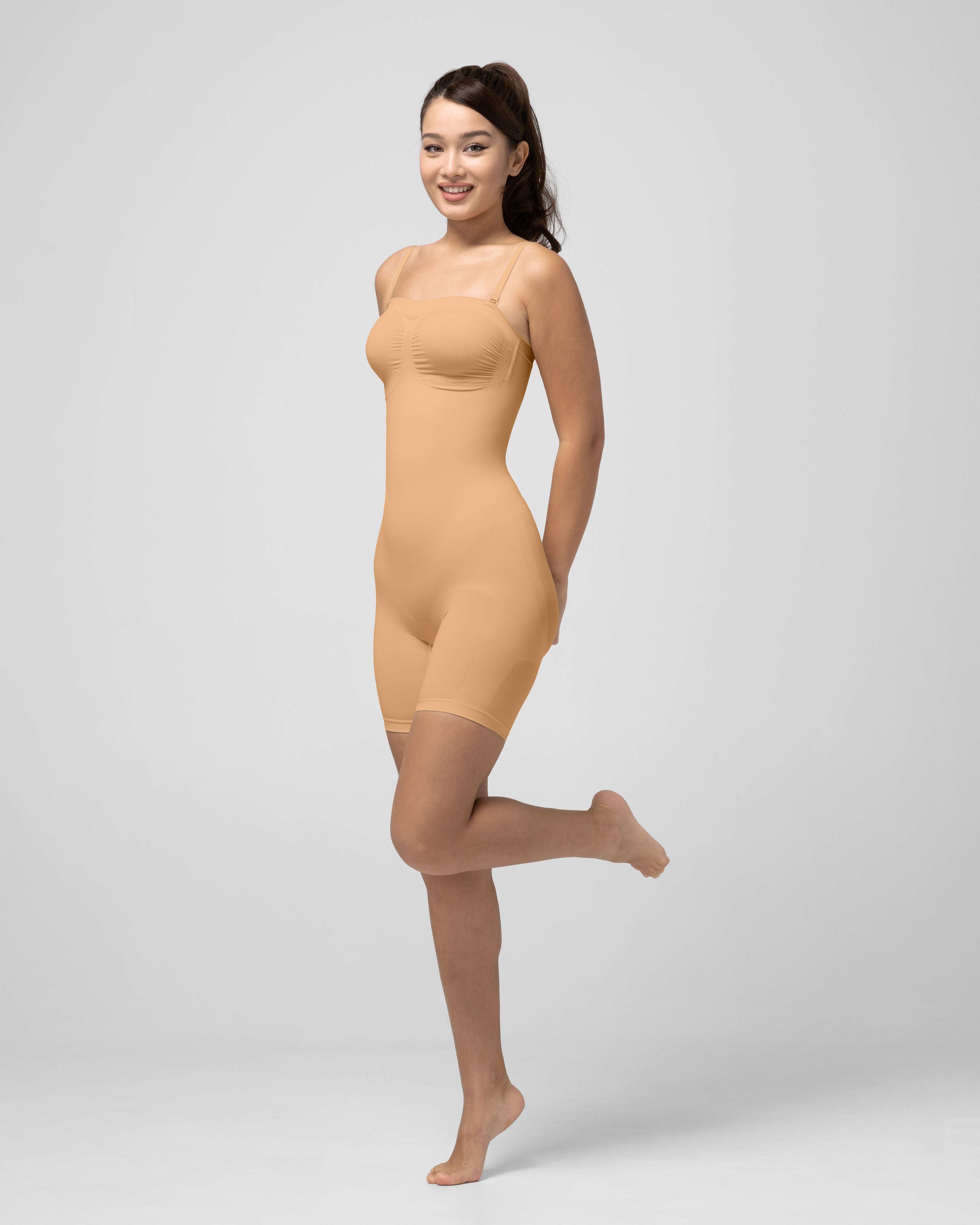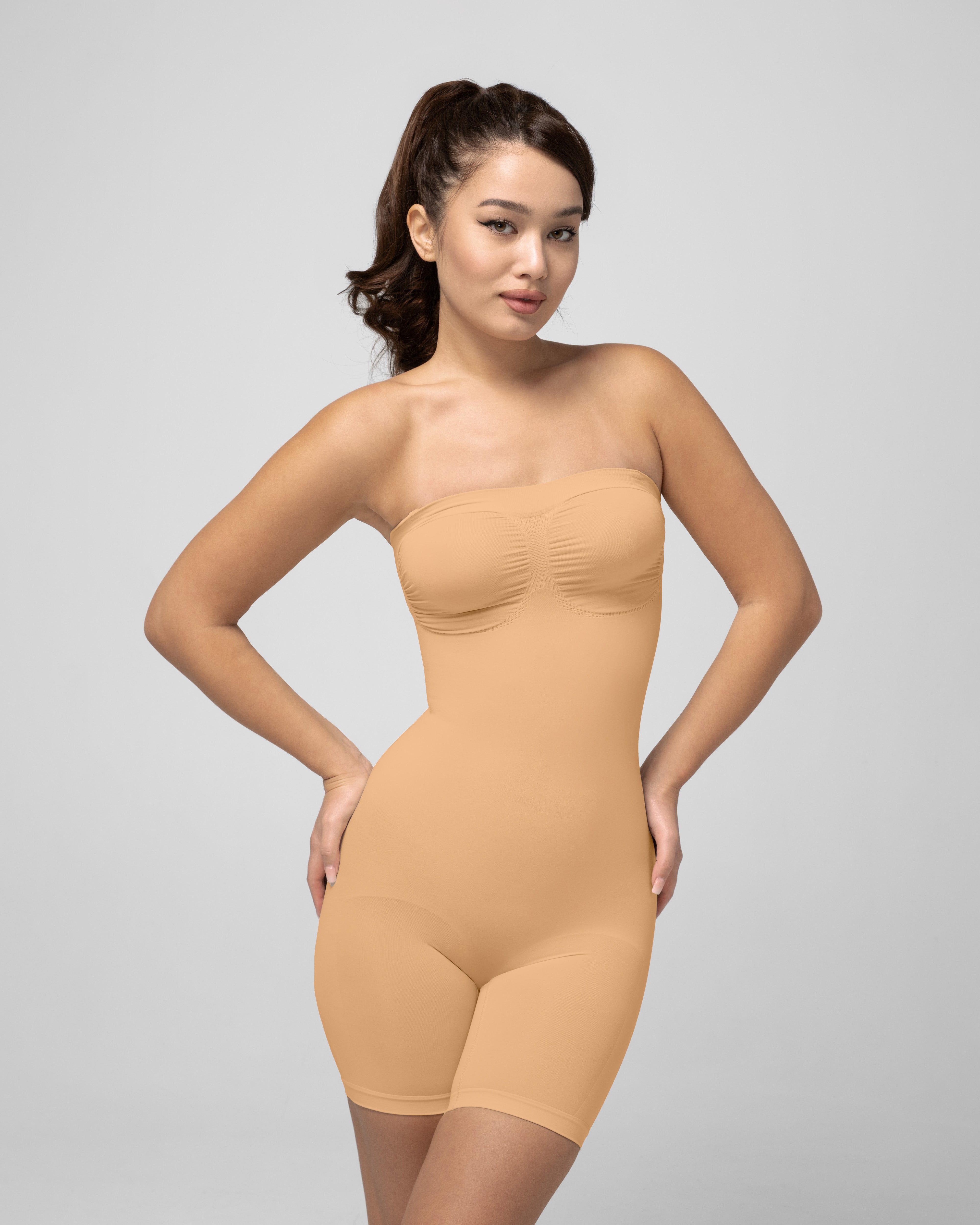 Утягивающее боди Tomyris без лямок создаёт плавный, грациозный силуэт, моделируя талию до двух размеров. Мягкое, но уверенное сжатие повторяет контуры тела, поддерживает грудь и дарит ощущение лёгкости. Материал прочный и податливый: оно удобно сидит под платьем, топом или жакетом, остаётся незаметным и двигается вместе с вами.
