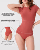 Қарапайым футболкадан айырмашылығы, бұл боди әрқашан орнында қалады және қозғалыс кезінде көтерілмейді. Ол силуэтті жұмсақ түрде реттейді, қыртыстар мен бұрылыстарсыз ұқыпты сәйкестікті жасайды және классикалық мойын сызығы мен тегіс материалдың арқасында кез келген көрініске оңай сәйкес келеді.