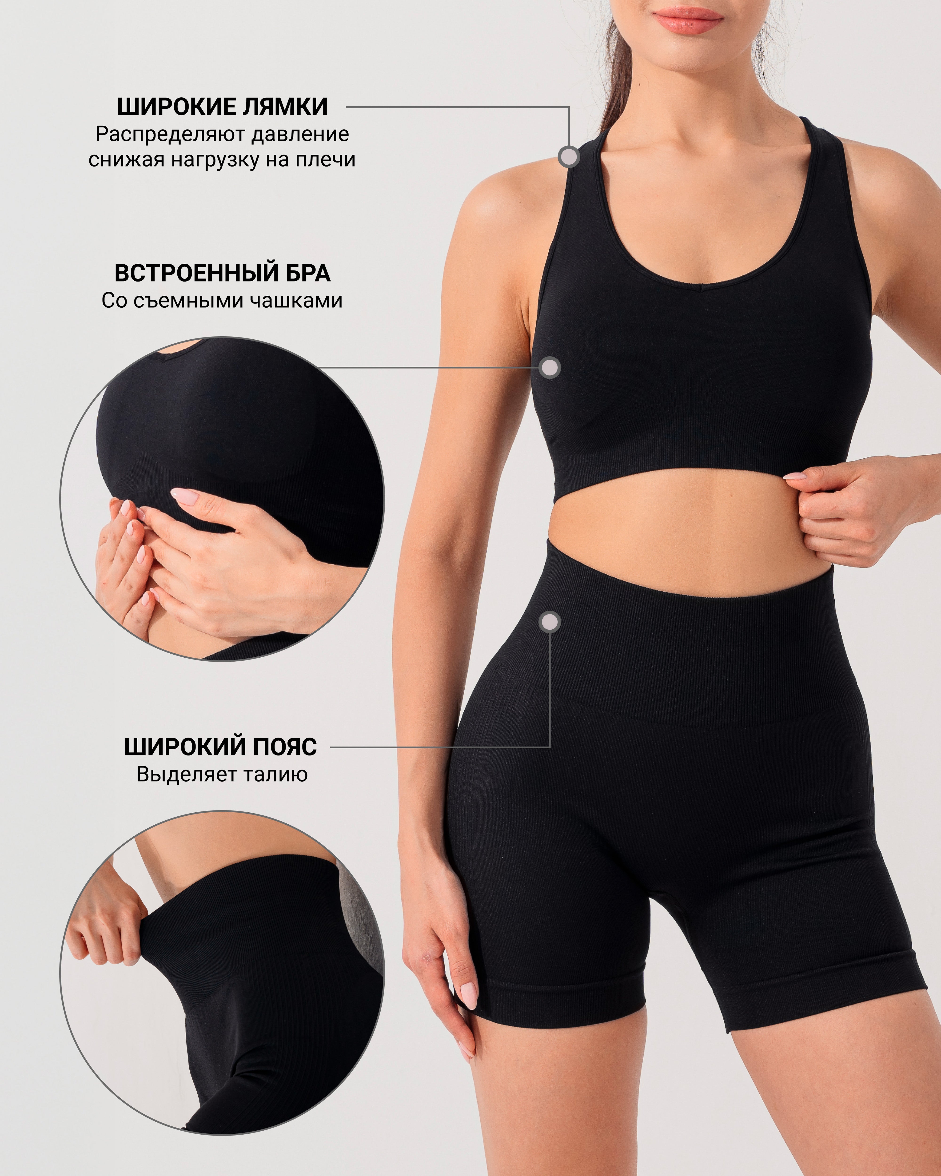ИЯ, жиынтықтың стильді дизайны оны тек спортзалда ғана емес, сонымен қатар күнделікті өмірде де қолдануға мүмкіндік береді, бұл фигураға жинақы және тартымды көрініс береді.