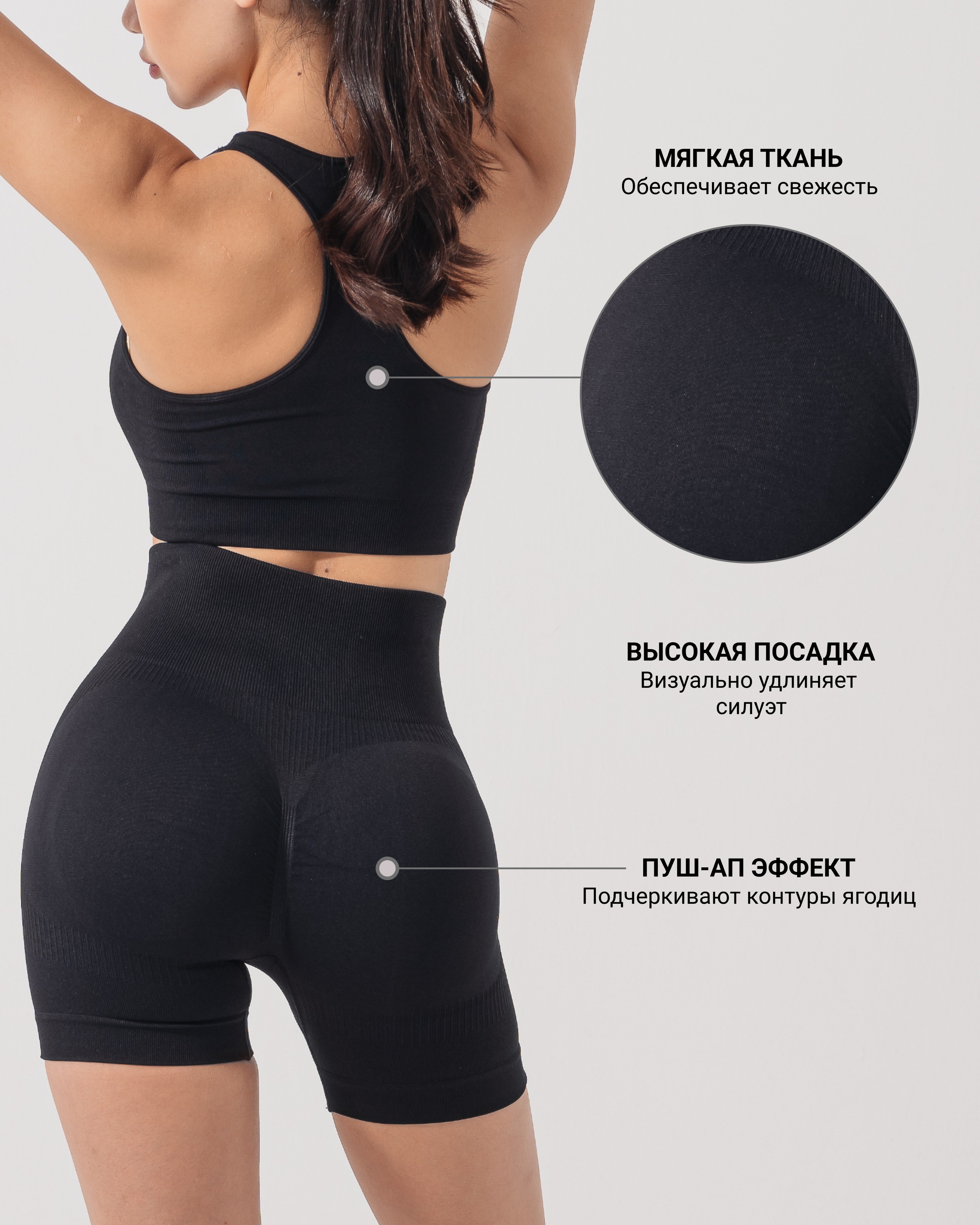 Жаттығу кезінде максималды жайлылық пен сенімділік үшін. Жұмсақ мата үйкелісті болдырмайды, ылғалды тиімді түрде кетіреді және қарқынды жүктемелерде де балғындықты қамтамасыз етеді. Арнайы пішу бөкселер мен жамбасты қолдайды, олардың пішінін ерекше көрсетеді.