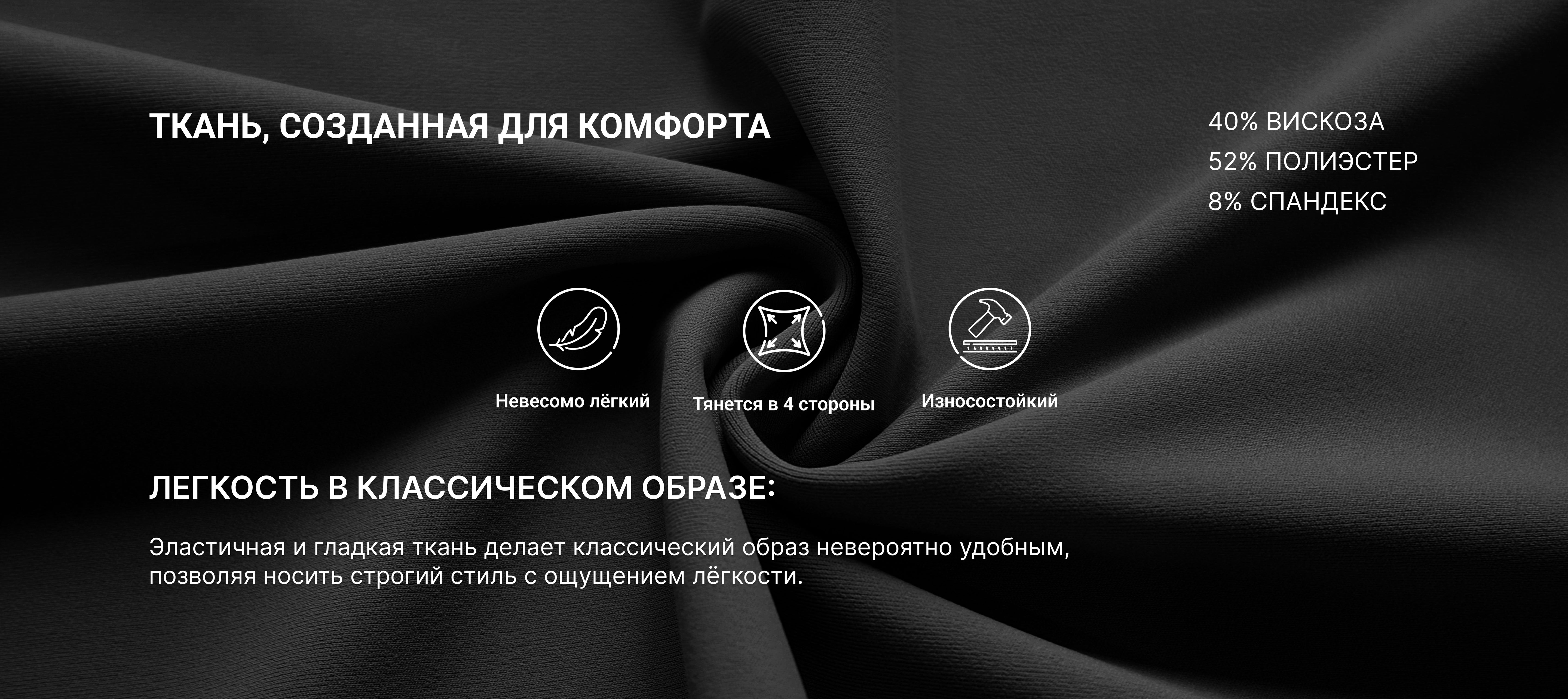 Классические брюки, которые выглядят идеально в любом движении. Мягкая бархатистая ткань обнимает тело, эластичность в четыре стороны дарит свободу движения, а плотная драпировка формирует стройный и грациозный силуэт. Ткань быстро сохнет, не теряет форму, следы воды легко сходят после стирки. Средняя талия и классический крой от бедра вниз создают комфортный и аккуратный вид, пояс с гладкой внутренней стороной и скрытые карманы делают их незаменимыми каждый день - в офисе, на встречах или в поездках.